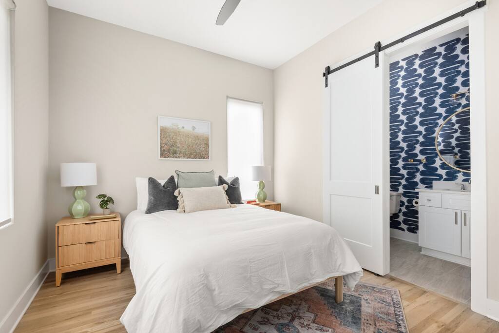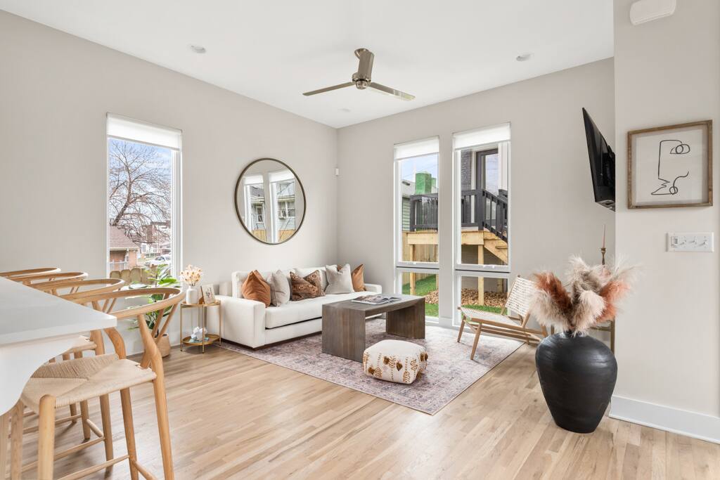 ✨ Nashville Townhouse Retreat Step into a stylish and serene escape at this modern townhouse, perfectly located in a quiet neighborhood just 1.9 miles from Broadway. With space for up to 10 guests, this home offers open-concept living, thoughtful amenities, and easy access to Nashville’s best dining, music, and nightlife. 🛌 Bedrooms & Layout Ground Floor: 1st bedroom with en-suite bathroom Second Floor: • King bedroom with private balcony + en-suite bath • Bunk room with 2 sets of twin bunks + en-suite bath Living Room: Twin sleeper sofa Every bedroom includes fresh linens, towels, and eco-friendly Plaine Products toiletries. ✨ Features & Amenities Kitchen & Dining: Fully stocked kitchen with refrigerator, stove, oven, microwave, dishwasher, blender, toaster, wine glasses, and all cooking basics Laundry: In-unit washer & dryer with detergent provided Work & Entertainment: Fast WiFi (18 Mbps), HDTV, Ethernet connection, and a dedicated workspace Comfort: Central air conditioning and heating, plush cotton linens, iron, and storage space Safety: 2 exterior cameras (front & back), smoke & CO detectors, fire extinguisher, and first aid kit Parking: Free driveway parking for 2 vehicles 🌟 Guest Perks Private entrances (front & back) Complimentary eco-friendly shampoo, conditioner & body wash Long-term stays welcome (28+ days) Thoroughly inspected before every stay 📍 Location Highlights Conveniently located at 2022B Herman St, Nashville, TN 37208 — just minutes from top attractions: 🎶 1.9 miles to Broadway (live music & nightlife) 🍴 Surrounded by top Nashville dining options 🏟️ 2.5 miles to Nissan Stadium 🎤 3 miles to Ryman Auditorium 🎸 3.2 miles to Country Music Hall of Fame ✈️ 10 miles to Nashville International Airport Things to Note Max overnight guests: 10 Same-day bookings are allowed with notice. For security: please avoid leaving valuables in vehicles (car break-ins are common in Nashville) A signed rental agreement + photo ID are required after booking Recycling available upon request (cans, bottles, cardboard in blue/clear bags) This townhouse is perfect for groups, families, and friends looking for a comfortable stay close to Broadway while still enjoying the peace of a quiet neighborhood.